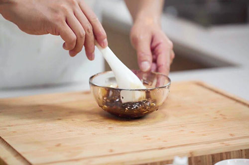 2.碗中放入蒜末、生抽1勺、醋半勺、蚝油半勺、白糖1勺拌匀调成酱汁;