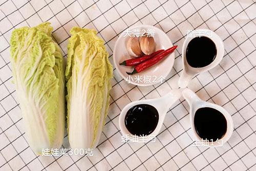 1.娃娃菜洗净,连续2次对半切开,小米椒2个切圈、蒜3瓣切末,葱2根切葱花;