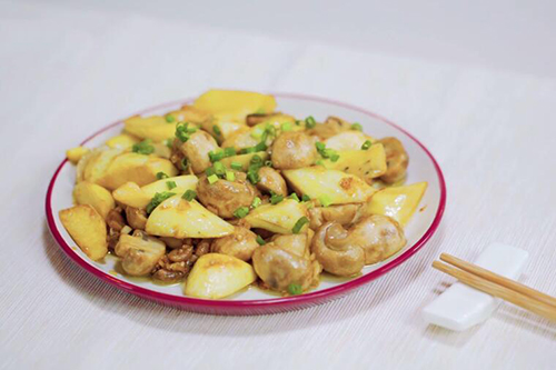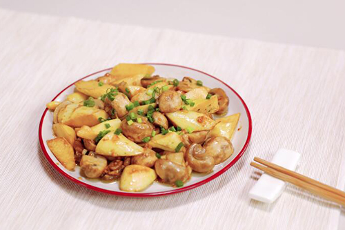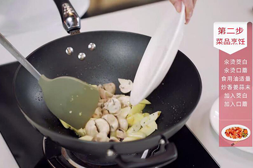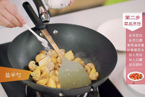 7.加入口蘑翻炒均匀,放入蚝油1勺、耗油茭白口魔的做法 茭白怎么做好吃盐半勺、鸡精半勺;