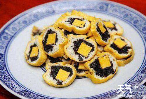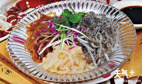 相传出自唐代中期。当时殿中御史王旭、监察御使李嵩、李全交三人贪脏枉法,作恶多端。长安西市品姓厨师愤怒之下,将猪肉皮、乌鸡皮、海蛰皮切丝当佐酒菜,名曰“剥豹皮”。近年西安饭庄在传统制法的基础上,改进定型成菜。三丝立为三堆,色泽分明,型如盆景,滋味各异,筋韧中带鲜脆,清爽利口。