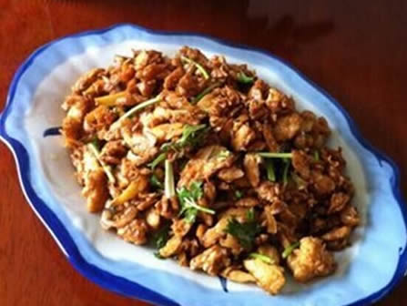 3、起油锅,下入葱姜蒜末炝锅,再下入鲅鱼丝,煸炒片刻后下入,食盐、酱油、米醋、芝麻油、香菜末,略翻即可。