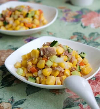 原料:甜玉米粒250克、原味油侵金枪鱼一盒、洋葱40克、胡萝卜40克、黄瓜60克。
