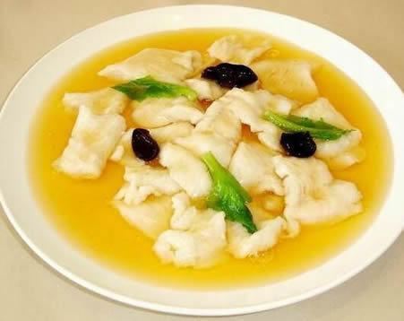 1、鱼去头后,片成两片,去骨去皮,取中段肉约15克切成1~2毫米厚的片,再在鱼片中放入鸡蛋清1个、食盐、料酒、淀粉各适量,拌均。