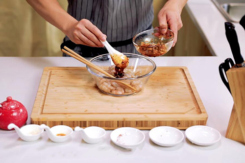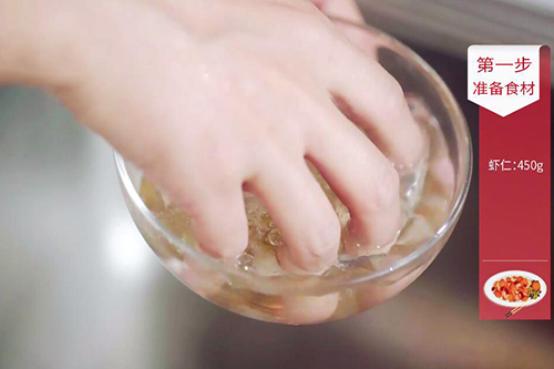 4.在虾仁中倒入1半调好的酱汁,腌制30分钟