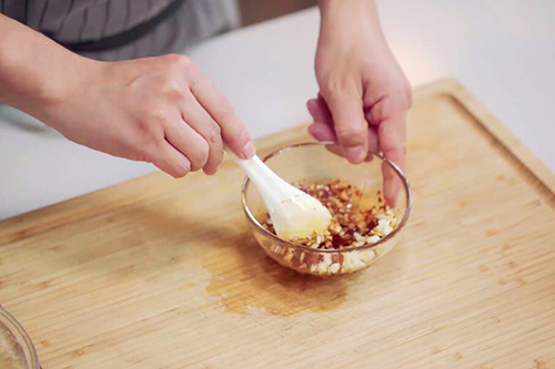 3.调酱汁:放入蒜末、姜末、盐1勺、辣椒粉1勺、橄榄油1勺、蜂蜜20克、生抽20克拌匀;