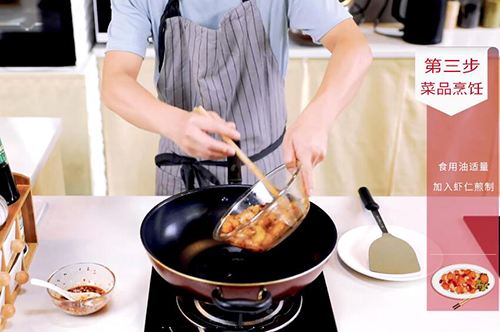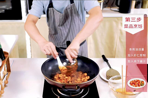 5.锅中放入适量油,油温烧至7成热,放入虾仁煎制,变色后翻面继续煎制1分钟;