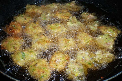 3、锅中倒油加热至六成,用勺子挖出萝卜面糊下油锅,至丸子浮起成金黄色即可,捞出沥干油份。