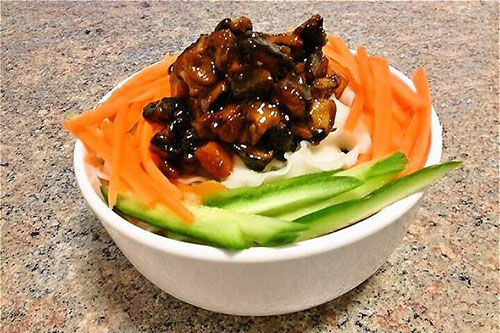 5、将面捞入碗里面,配上黄瓜丝和萝卜丝,舀上一勺香菇炸酱就可以了。