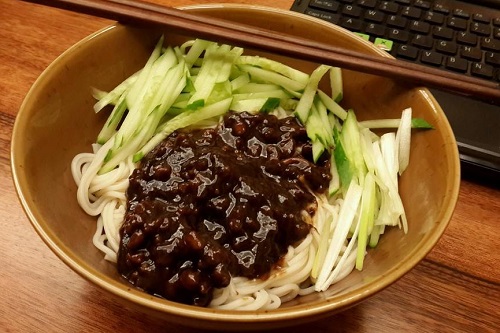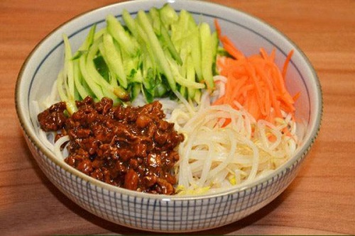 7.炸酱做好后,用大锅将面条煮好捞出,码上菜码(黄瓜、胡萝卜、芹菜等),浇上炸酱,拌好就可以吃了。