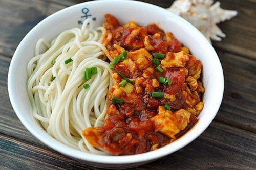 6、煮好的面过水,切好的菜和炒好的酱拌在一起,就可以吃了。