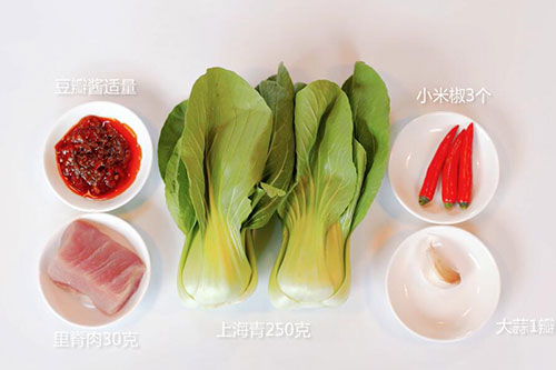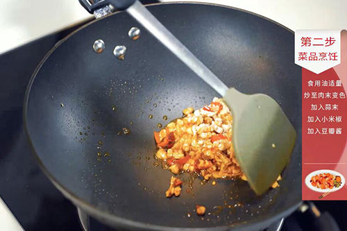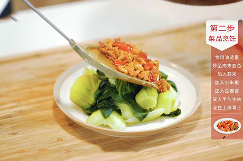 4.锅中放入适量油,油温烧至7成热,肉末浇上海青的做法 上海青怎么做好吃放入肉末炒至变色,加入豆瓣酱半勺、切好的蒜末、小米椒炒出红油;