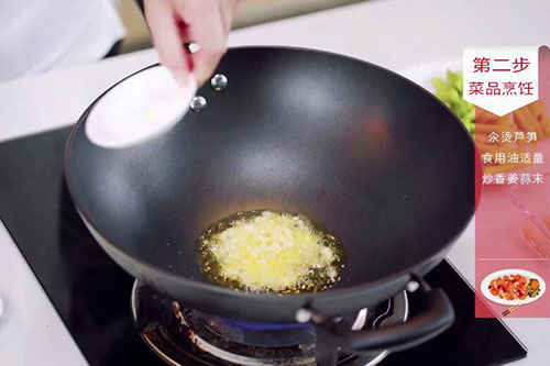 5.锅中放入适量油,油温烧至7成热,放入姜蒜末炒香;