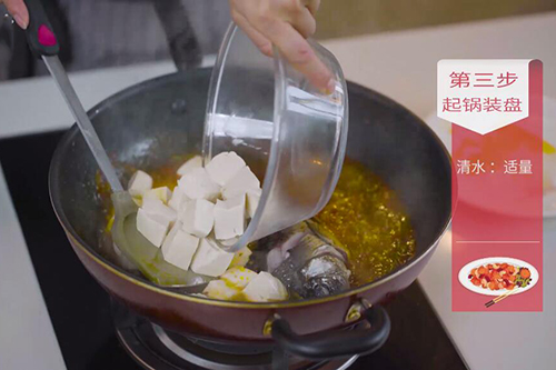 5.放入豆瓣酱炒香后加入清水煮开,放入鱼和豆腐,中火烧5分钟