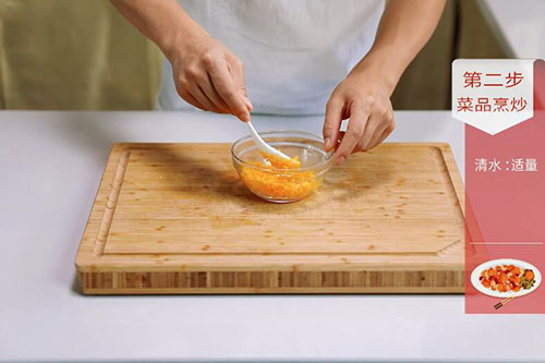 2.咸蛋黄3个切碎后放入碗中,加入料酒1勺;
