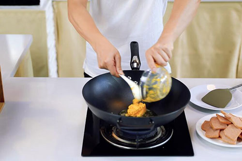 5.锅中放入适量油,油温烧至6成热,放入咸蛋黄泥,小火炒香;