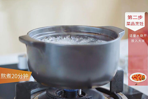 4.锅中放入清水,大火烧开,放入大米煮开后转小火熬煮20分钟,期间不定时搅拌,防止糊锅;