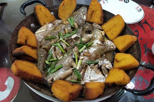 咸鱼饼子是烟台的名吃,从沿海的渔民传下来的,吃咸鱼饼子很简单,用新鲜的海鱼,盐腌过后,晒干置于铁锅里,搁少许油煎一下就好了,和玉米面饼子一起吃,很有饱腹感,口味香、鲜、嫩,不少人都喜欢吃,尤其是当地的烟台人,很多餐厅都会供应。