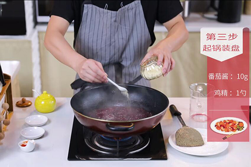 8.大火煮开,放入番茄酱10克,转中火煮5分钟,大火收汁,放入鸡精1勺调味即可。