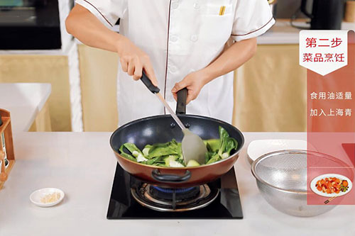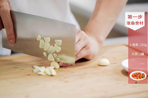 3.锅中入适量油,油温烧至7成热,放入蒜片炒香,放入上海青翻炒至断生;