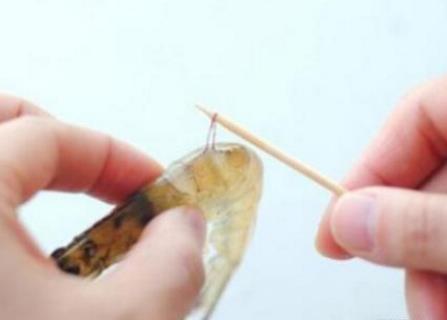 方法一:使用牙签插入虾背第二节,划开后直接挑出虾线。