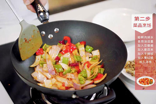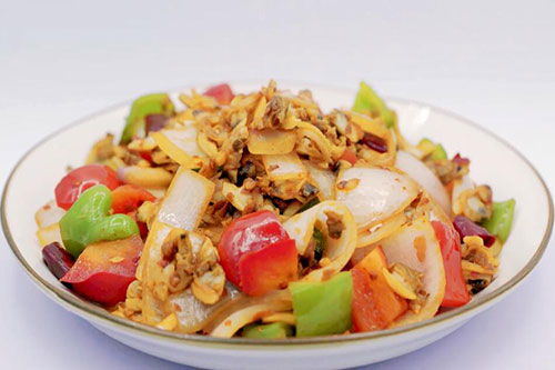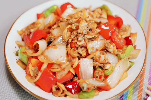 5.放入青红椒、小炒蛤蜊肉的做法 蛤蜊肉怎么炒好吃洋葱块翻炒均匀;