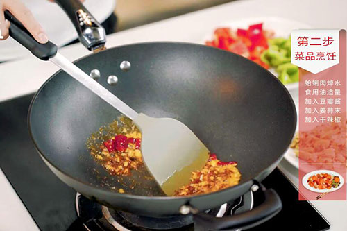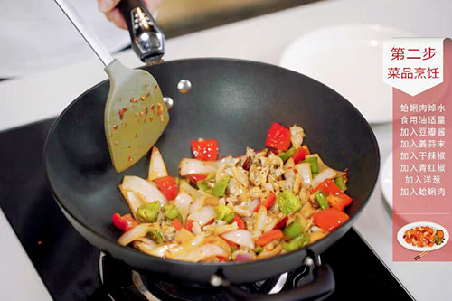 6.加入蛤蜊肉继续翻炒,放入料酒半勺、生抽半勺,盐半勺、鸡精半勺翻炒均匀后即可出锅。