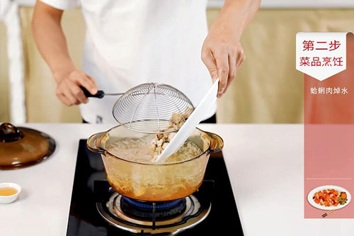3.锅中放入适量水烧开,放入蛤蜊肉、料酒1勺焯水1分钟后捞出待用;