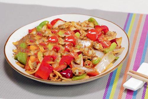 蛤蜊肉300克,洋葱半个,青椒1个,红椒半个;