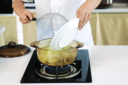 4.锅内倒入适量清水烧开,滴几滴油,放入芦笋段焯水1分钟后捞出;