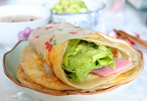 洛阳的早餐除了胡辣汤以外,还有一个比较“受宠”的就是鸡蛋灌饼了。鸡蛋灌饼也是北方人比较喜欢的烙饼的一种吃法,不同的是将打好的鸡蛋液放进半熟的烙饼中,然后再将饼烙熟,可以根据自己喜好加入一些如生菜、土豆丝的配菜,再由自己的口味放入甜面酱或沙拉酱,一个完整的鸡蛋灌饼就做好了,味道酥脆鲜香,诱人无比~
