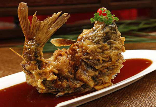 鲤鱼为黄河名鱼,自古就有洛鲤伊鲂,贵似牛羊之说。肉嫩味美,营养丰富,闻名中外。鲤鱼跳龙门,造型优美,寓意吉祥。只见烹制好的鲤鱼,昂首盘中,栩栩如生,仿佛欲跃而起。加之有青山衬托、状如门阙,颇富山野情趣。食之味美无穷。