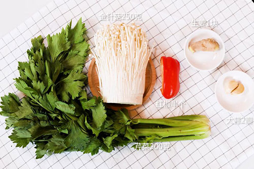 芹菜金针菇的做法 芹菜金针菇怎么做好吃金针菇洗净切去根部,芹菜切段,红椒切丝,姜1块切丝,蒜2瓣切片;油锅烧至7成热,放姜丝、蒜片炒香,放芹菜、金针菇炒至断生,放红椒丝继续翻炒半分钟,调入盐半勺、鸡精半勺即可。