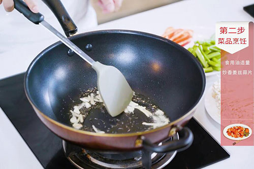 2.锅中放入适量油,油温烧至7成热,放入姜丝、蒜片炒香;