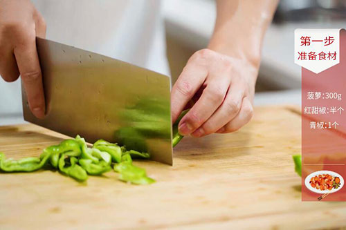 虾仁200克,菠萝300克,红甜椒半个,青椒1个;