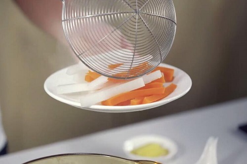 3.,放入白萝卜、胡萝卜焯水1分钟,捞出沥干;