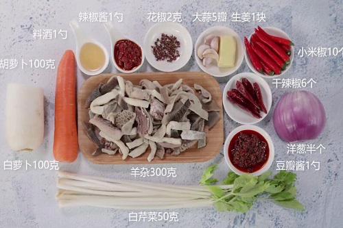 羊杂300克,白萝卜100克,胡萝卜100克,白芹菜50克,洋葱半个,小米椒10个,姜1块 蒜5瓣,干辣椒6个,花椒2克;