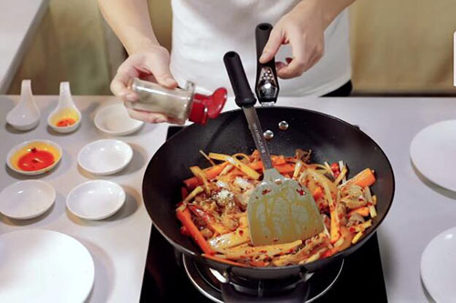 6.放入切好的小米椒炒匀,放入羊杂、胡萝卜、白萝卜、洋葱丝、芹菜段炒匀。加入料酒1勺、盐1勺、鸡精半勺、白糖半勺、胡椒粉1克翻炒均匀
