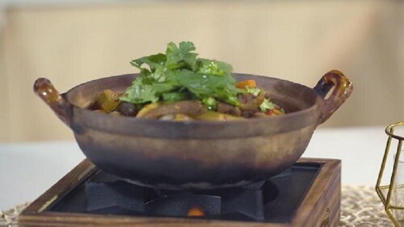 7.砂锅中倒入炒好的羊杂,小火煨煮,收汁后撒上葱花、香菜即可。