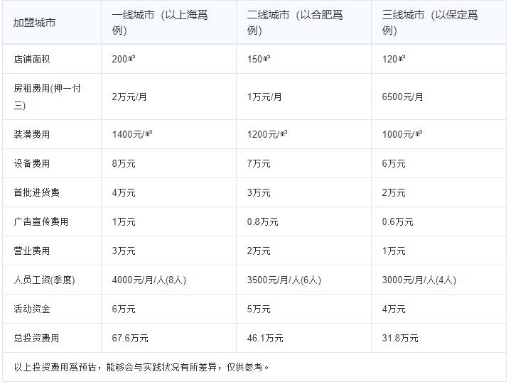 要想加盟一家查理士茶餐厅,根据上表估算至少需要31.8万元以上,其中备费用6万元、首批进货费2万元、广告宣传费0.6万元、开业费用1万元、流动资金4万元等等。实际情况根据地域可能有所变化。
