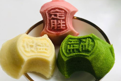定胜糕是杭州传统糕点,定胜糕始于宋代,至今已经有几百年的历史了,据说这是南宋时百姓为韩家军出征鼓舞将士而特制的,因为糕点上面有定胜的字样,所以这道糕点取名叫定胜糕。定胜糕外层是精制的香米和糯米粉,里面一般是豆沙馅,中间混合了白糖和桂花,清甜可口。