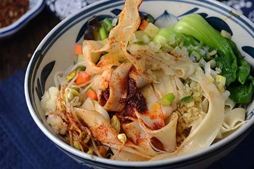 新野板面也被叫做张飞板面,是南阳的传统的面食小吃。南阳夜市小吃有什么比较有特色,这道新野板面一定是其中之一,和一般的面食不同,新野板面用料比较讲究,吃起来鲜香爽口,耐嚼、香中泛辣、辣中透香。新野板面之所以风味独特,一是面好,二是臊子好。
