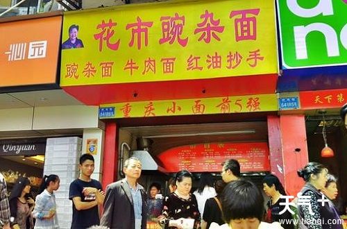 重庆曾评选过小面20强、50强之类,有好几家都在解放碑,而且都是有些年头了。花市豌杂面就是这样一家,门头招牌“重庆小面前5强”,名气可想而知。他们家的豌杂可作为豌杂中的战斗机了。一天可能接近10个小时外面都是排排小板凳坐起吃面的人。 来重庆必吃小面,它家小面也要尝一下,记得必须加煎蛋。