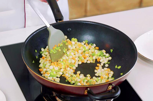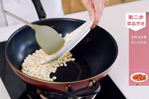 3.锅中放入适量油,油温烧至7成热,放入玉米粒;