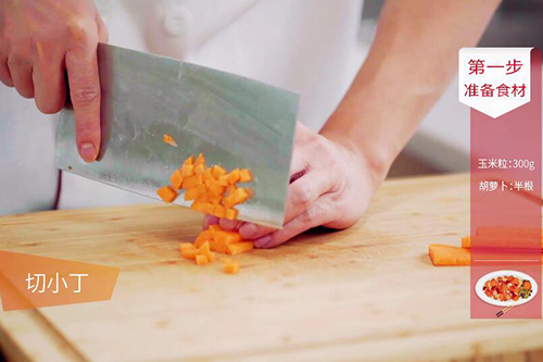 4.胡萝卜丁翻炒2分钟,放入青椒丁继续翻炒半分钟;