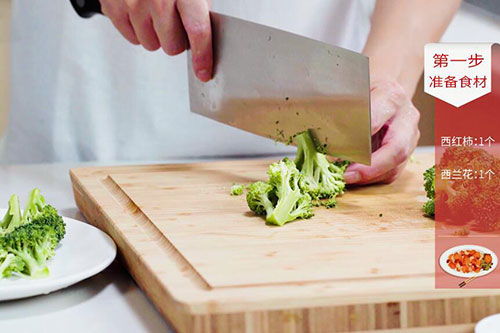西红柿洗净切块,西兰花切块,蒜切末,西兰花放入锅中滴2滴油,焯水1分钟捞出放凉,油锅烧至7成热,放蒜末炒香,放番茄炒出汁,放西兰花炒匀,放盐,鸡精拌匀即可。