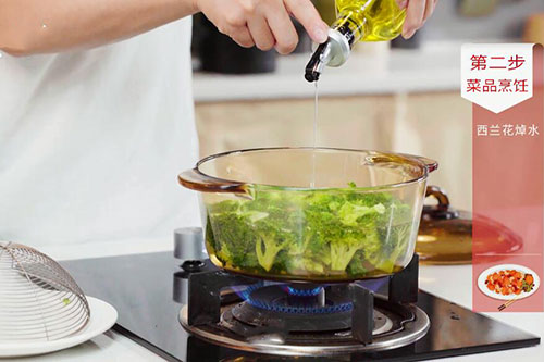2.锅中放入适量清水,将西兰花放入锅中,滴2滴油,焯水1分钟,捞出放入凉水中冷却后沥干;
