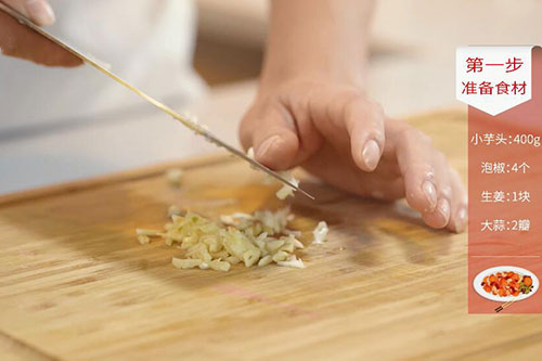 1. 芋头洗净,切块。泡椒4个切碎,姜1块切末,蒜2瓣切末;