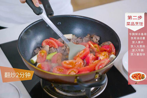 4.锅中放入适量油,油温烧至5成热,放入姜片、大葱段,放入牛腩,番茄块翻炒2分钟;