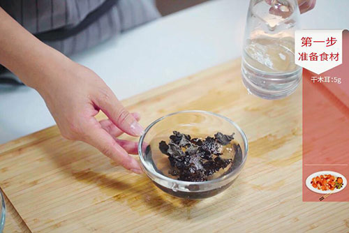 1.干木耳用清水泡发(如有大朵的木耳可以撕小一些);