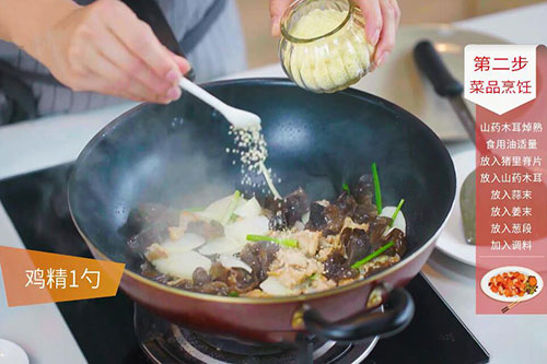 6.放入山药、木耳、葱段继续翻炒1分钟,调入盐1勺、鸡精1勺即可。